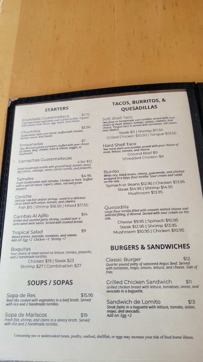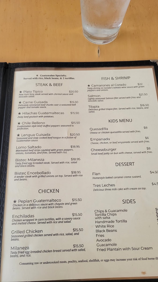 The Steak/Beef section is rich with options like the savory Plato Tipico Chapin and the crispy Bistec Milaneza. For those looking for something unique, the Carne Guisada and Hillachas Guatemaltecas bring authentic Guatemalan tastes to the table, while the Chile Relleno continues to be a favorite.