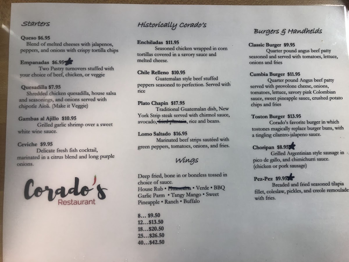 The Historically Corado's section features hearty, comforting classics like the flavorful Enchiladas, the rich Chile Relleno, and the traditional Plato Chapin. The Lomo Saltado is another great choice for those craving a fusion of Latin American flavors. Moving to the Burgers & Handhelds section, the Classic Burger offers a straightforward, satisfying bite, while the Cumbia Burger and Toston Burger each bring their own unique twist. Don’t miss the Choripan and Pez-Pez for a taste of Argentinian-style sandwiches.